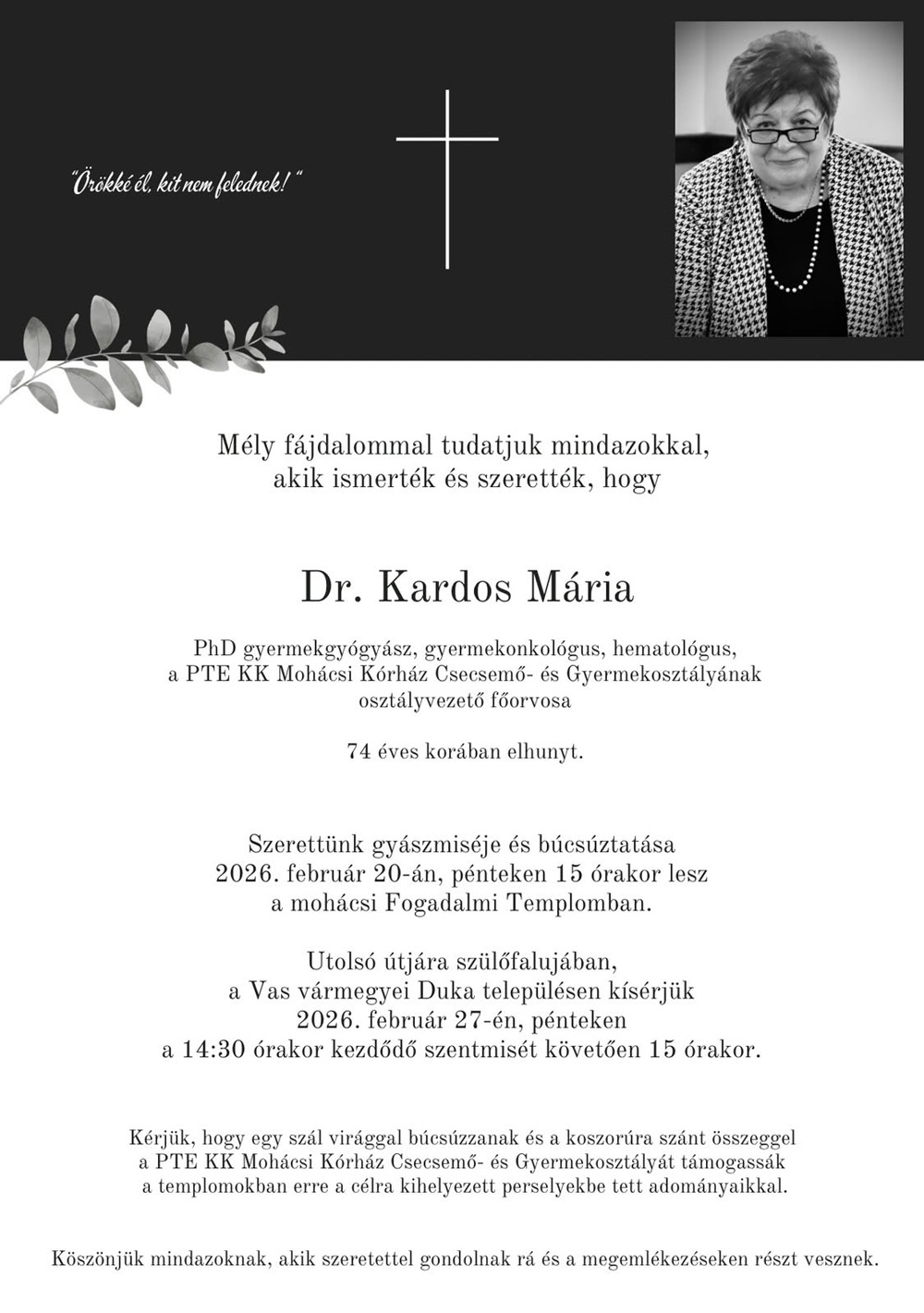 Mély megrendüléssel tudatjuk, hogy 2026. február 12-én elhunyt Dr. Kardos Mária PhD gyermekgyógyász, gyermekonkológus, hematológus főorvos, a hazai gyermekhematológia és hemofília-ellátás meghatározó alakja.